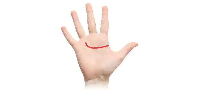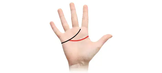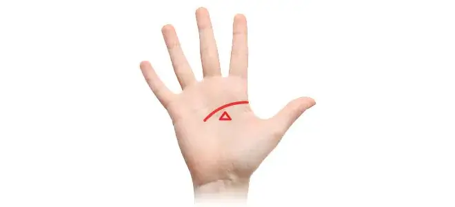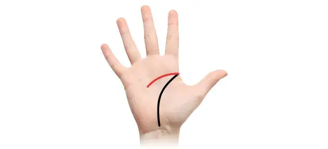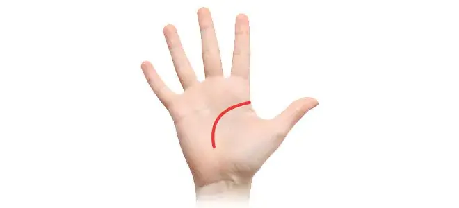 たとえば緩やかなカーブで先端が月丘に向かっている場合、明るくユニークな性格の持ち主であることを示します。月丘とは小指下の手首に近い部分のふくらみのエリアを指します。