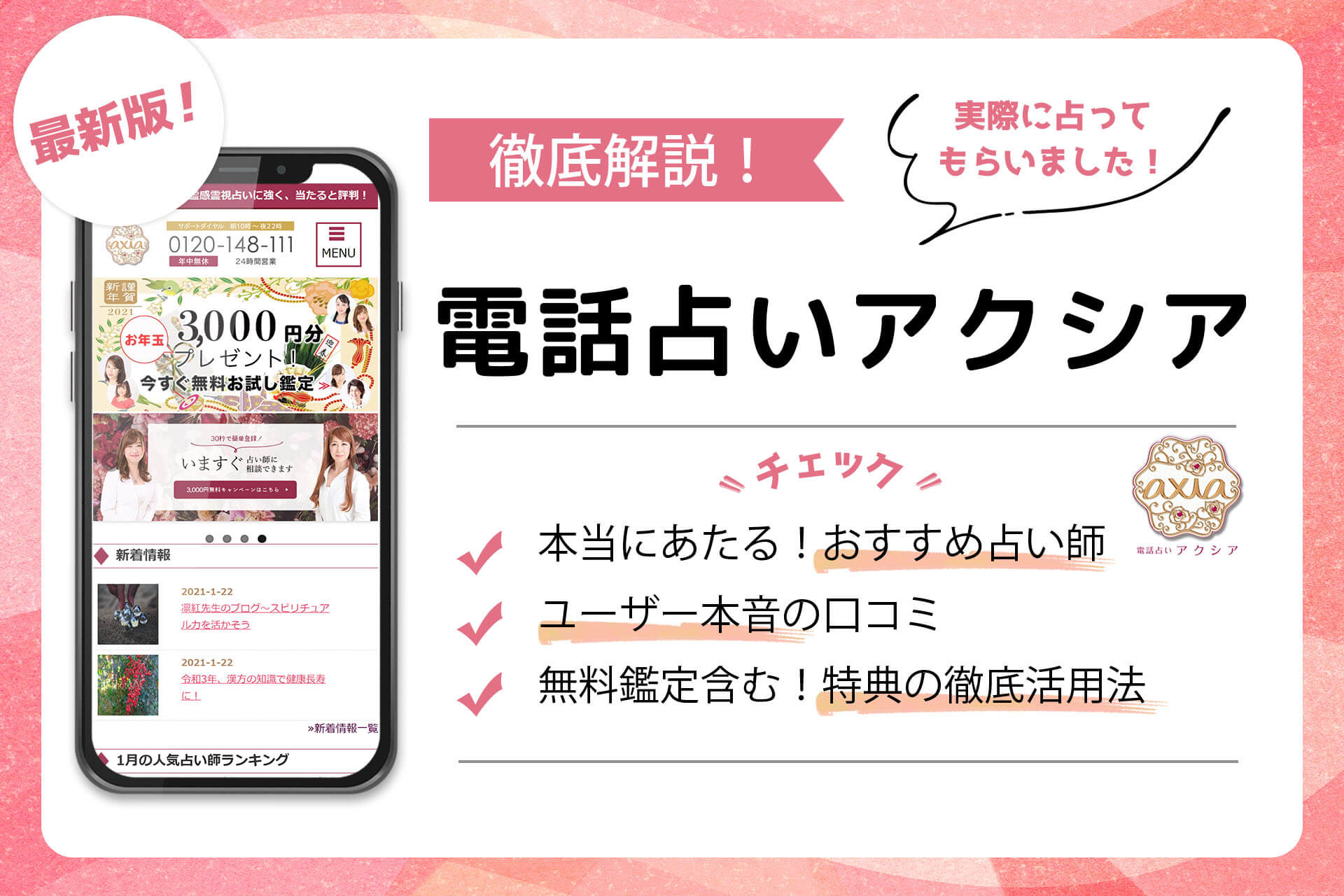 この記事では、電話占いアクシアのおすすめの先生をランキング形式でご紹介します!もちろん、電話占いアクシアの料金やシステム、サポートセンターの対応まで網羅していますのでご安心ください。電話占いアクシアを徹底解説しちゃいます!