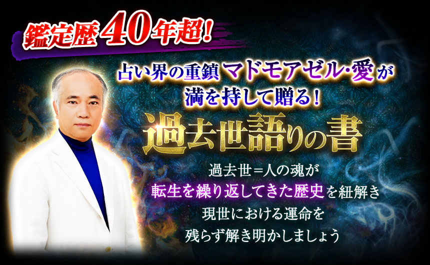 マドモアゼル・愛が贈る新境地【過去世語りの書】。ここでは、あなたの魂の転生の記憶を紐解き、過去世からの因縁で結ばれ、現世であなたを好きになる人が無料でご確認いただけます。