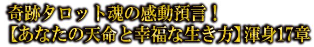 大人気の奇跡タロットが贈る魂の究極鑑定! 今後の人生に授けられた天命、そして魂が輝き幸福になれる生き方まで……全17章に渡って運命を細密に読み解いて参ります。カードの出す答えが、必ずやあなたの迷いを晴らし未来へと導いてくれるでしょう。