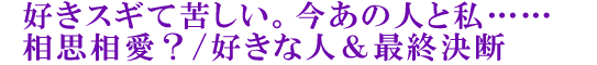 好きスギて苦しい。今あの人もそんな想いを抱えているのでしょうか。それがあなたと同じ気持ちならば、この苦しみも救われるでしょう。今あなたがこの辛さを耐える意味があるのか否か、キッパリ結論を下します。