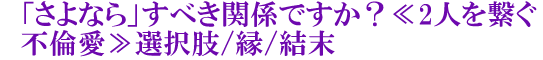 一歩を踏み出すことのできない不倫関係。このまま別れた方が2人は幸せになれるのでしょうか……。あなたとあの人がこの先選ぶべきなのは、どんな道か。2人が紡いでいる愛の結論、至る結末、お伝えいたします。