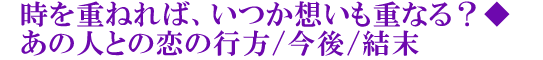このまま時間をかけていけば、いつか想いは届くのか。2人の恋の行方を霊視いたします。確かに今は苦しい時期かもしれません。これからも待ち続ければ時が解決してくれるのか……結末まですべてお教えしましょう。