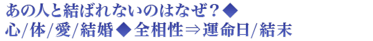 胸が張り裂けそうな、あの人への想い。それなのに、なぜ結ばれないのでしょう? その理由を、全相性から解明していきます。2人の運命をガラリと変える日が訪れた後、あなたとあの人は1つになれるのでしょうか?