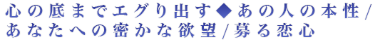 相手の本心を丸裸に! あなたは相手にどう思われているのか、この恋に脈はあるのか……気になっているなら必見! 相手が密かに抱く欲望や今後の願望まで、あなたが今すぐ知りたい全てを解き明かします。