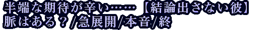 「付き合えるかもしれない」ってただの私の希望的観測? 実際は脈なし?◆結論を出さない彼に悩むあなたのために、本心とこの恋に残された可能性を明らかにします。あなたの気持ちは報われるのか結論を下します。