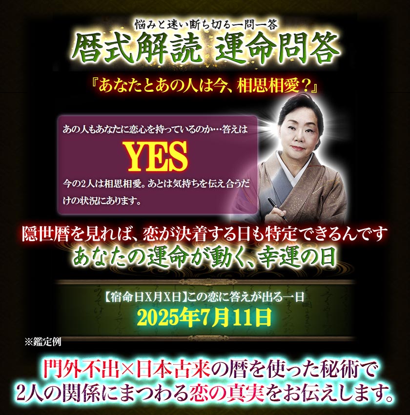 旧暦よりも更に古く、密かに受け継がれてきた「隠世暦」で あなたとあの人のお生まれを読み直せば……現代の誕生日占いでは読み切れない2人を繋ぐ本当の縁も、この恋が行き着く最終的な結末も全て明らかにすることができるんです。