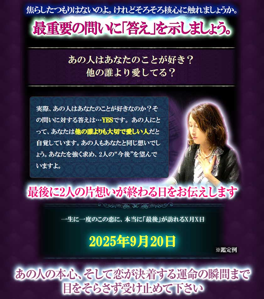 『憧れの人に告白されました』『4年諦められなかった彼と結ばれ結婚しました』恋しい相手に誰より愛され、将来の約束までできると口コミ続出の【恋占の決定版】あなたとあの人の宿縁を結び、永遠の愛を導きます。