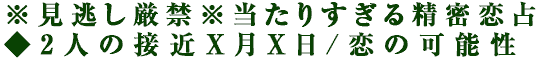 『大好きなあの人と1mmでも近付きたい』あなたがそう願っているのならこの占いは【必読】です。2人が次に接近する日と出来事を【精密的中】運命のX月X日を活用し、恋成就の可能性を高める方法までお教えします。
