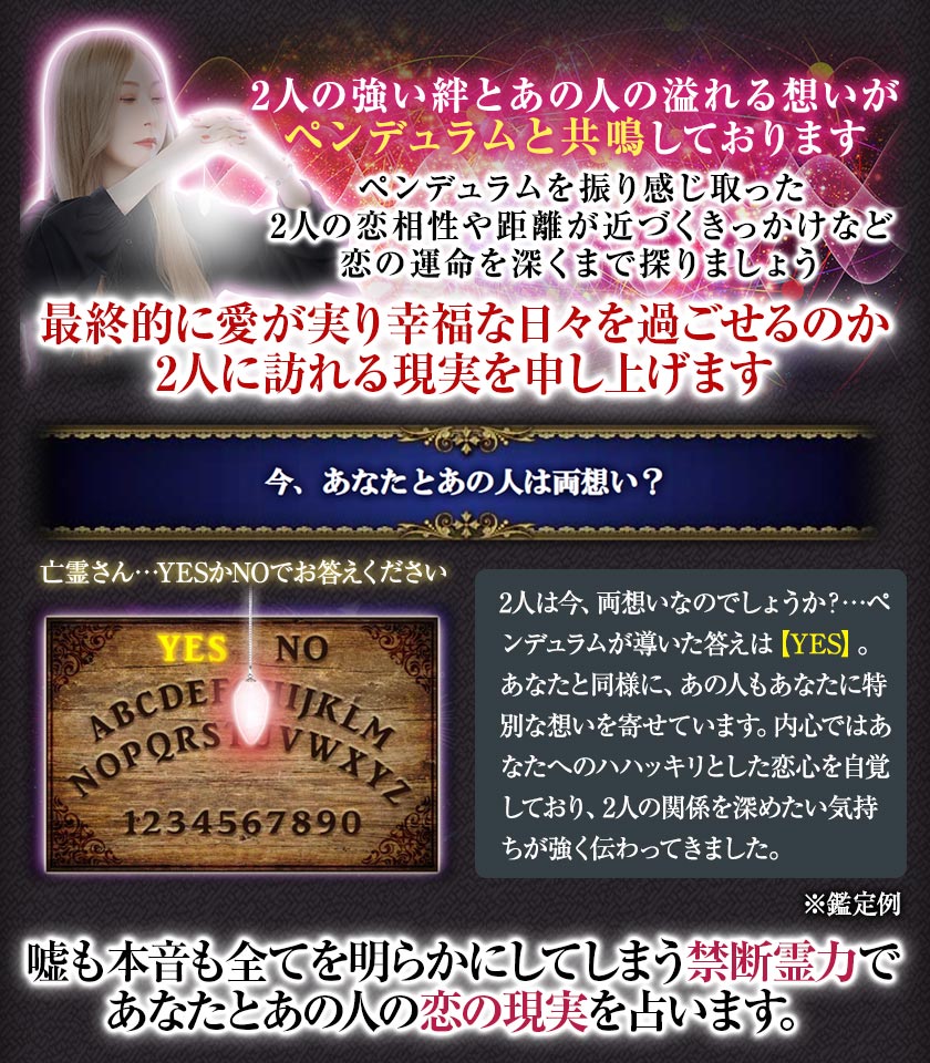 あなたとあの人を見守る亡霊をペンデュラムに集め、2人の愛を成就させる絶対的な言葉をお伝えします。今あの人とどんな宿縁で結ばれるているのか…交際に至る経緯も明らかにしていきましょう。
