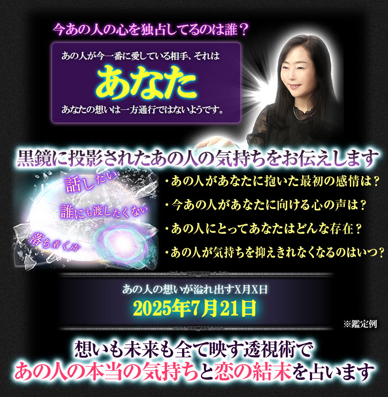 水、ガラス、窓……光を反射するもの全ては鏡となり、この世界にちりばめられた無数の鏡は全てが私の「目」となります。全ての鏡にアクセスする“黒鏡”を覗き、想いを寄せるあの人の心の中や2人の最終的な関係まで…… 真実を視通しましょう。