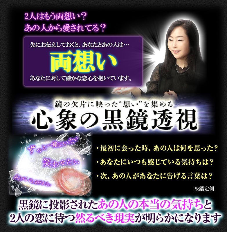 水、ガラス、窓……光を反射するもの全ては鏡となり、この世界にちりばめられた無数の鏡は全てが私の「目」となります。全ての鏡にアクセスする“黒鏡”を覗き、想いを寄せるあの人の心の中や2人の最終的な関係まで…… 真実を視通しましょう。