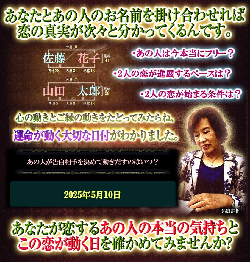 あなたや、あなたが好きなあの人を見守ってくれているたくさんの人たちが、長い長い「家族の歴史」と一緒に受け継いできた『姓』と、生まれて一番最初に慈しんでくれた人たちが悩んで決めた『名』にはね、その人の運命や心の全てが詰まっています。2人のお名前の画数と響きを読み解けば、あの人の気持ちも恋の行末も……知るべき事は全部明らかになりますからね。