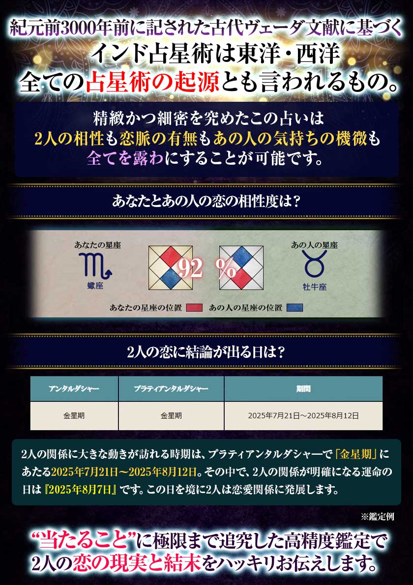 ≪両想いを叶える宿縁鑑定≫インド占星術では、様々な面での2人の相性を総合的に明らかにしていきます。2人の生まれた時の天体図と今の状態から、あの人との恋運命、2人の絆を明らかにしていきましょう。