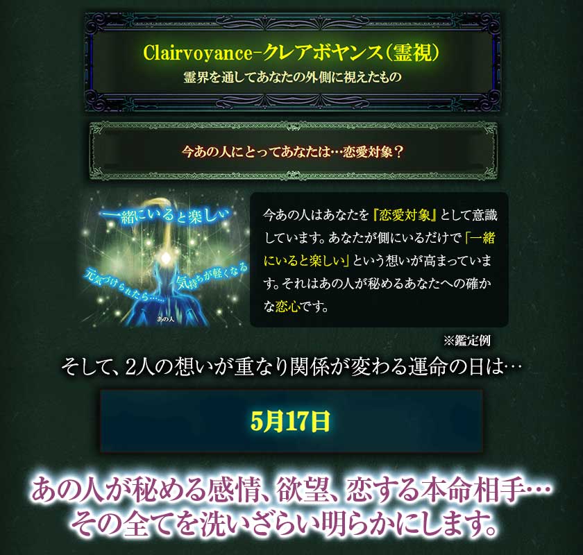 私が使うサイキック能力が他のものと異なるのは、3種類の特殊な霊視法とサイキックカードによって運命の全てを掌握することにあります。まずは霊界と繋がり、あの人の本当の感情を捉えます。あなたが予想すらしていなかったあの人の想い・愛欲・期待・秘める願望が新たに発覚するはずです。恋の決断はそれからでも遅くありませんよ。
