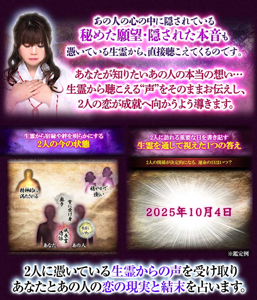 【2人の宿縁を結ぶ生霊霊視】実らないと諦めていた恋も、霊視の力で強制成就させましょう。2人の間に繋がる恋縁から相性、あの人が抱くあなたへの想い、最終的に訪れる恋の結末まで、明らかにしていきます。
