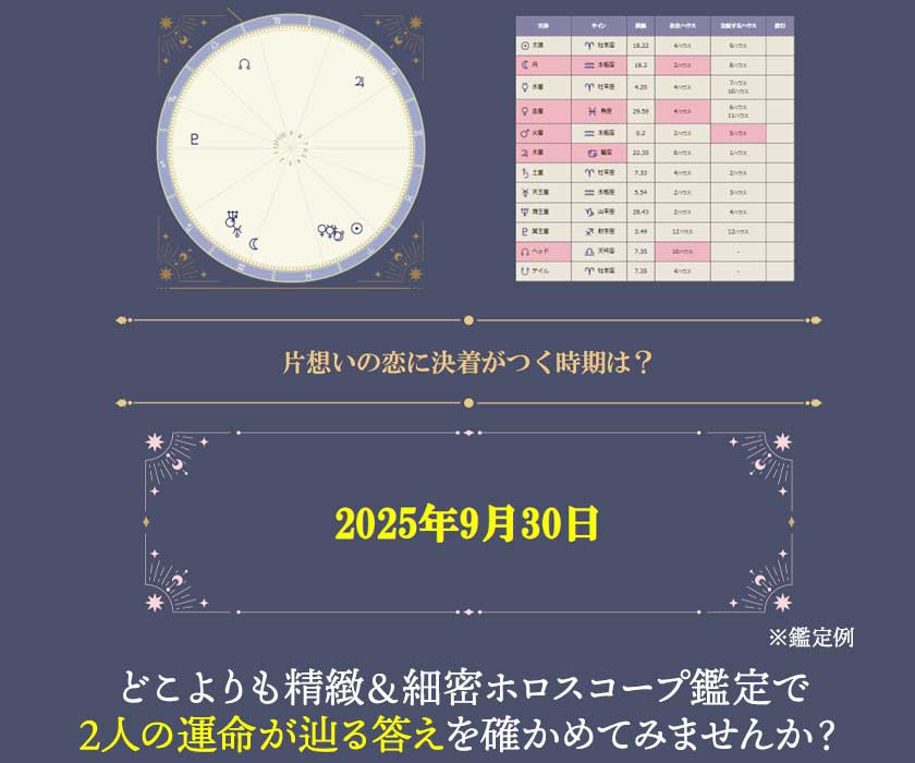 ホロスコープ鑑定はあの人の心の動きや、2人の恋が行き着く未来まで、詳細に読み解くことができる繊細かつ奥深い占いです。あなたとあの人が生まれた瞬間の星の位置を重ね合わせて1つにした「コンポジットチャート」から、2人に繋がる宿縁、恋愛や結婚の相性、そして2人の恋に決着がつく時期まで1つずつ丁寧に読み解いていきましょう。