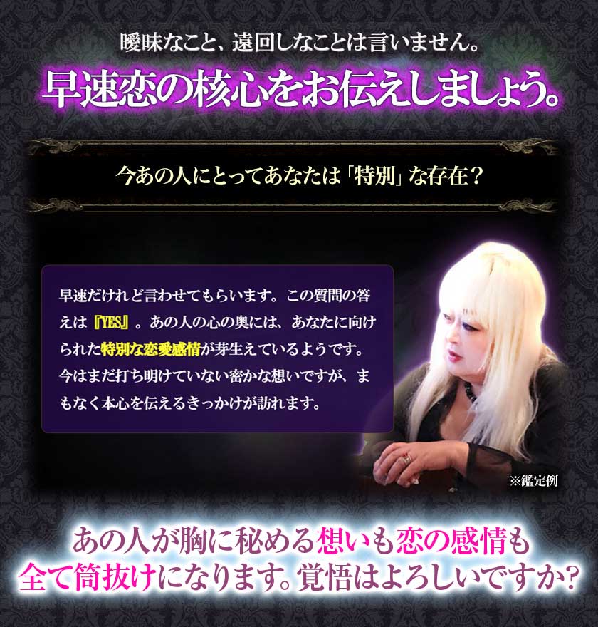 こうしてお会いしただけで、あなたが想いを寄せるあの人の感情や気持ちが次々と浮かんで視えてきました。今から特別なカードに問いかけて、さらに深いところまであの人との恋愛について視通していきます。私が視たものも・感じたもの……その1つ1つを細部にわたってお伝えします。あの人の気持ちを知る準備はいいですか?