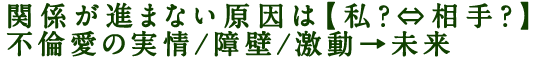 大きな壁がある禁断の不倫関係。今、2人の関係が進まない原因は“あなたとあの人”どちらにあるのでしょうか? 内に秘められた実情を探り、2人の未来と最終的な縁についてお教えします。