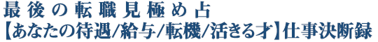 転職すべきか、もう少し頑張るべきか。心揺れ動くあなたに正しい選択を断言いたしましょう。あなたが手にする未来と報酬、そしてチャンスを掴む方法まで事細かに伝授。既にあなたの人生は成功したも同然なのです。