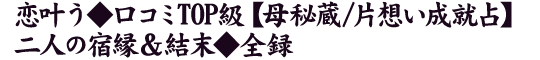 “恋叶った!”片想い男女ゾクゾク成就×口コミ評価TOP級の実力で、二人の全宿縁と二人の恋の結末を徹底的に見ていきます。数え切れない男女の恋を成就へ導いた、占界最後・母秘蔵の宿縁鑑定をご体感ください。