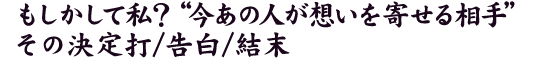 「脈を感じるけど、確証が持てない……。」そんなあなたにお答えします。あの人が今想いを寄せる相手がどなたで、最終的に二人は結ばれるのか。恋の結末まで全て分かってしまいますが、覚悟はよろしいでしょうか?