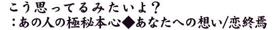 あの人があなたに対してどんな感情を抱いているのか、気になりませんか?これからあの人の心の中の極秘本心を覗いていくよ。この恋に待ち受ける終焉についてもお知らせするから、十分覚悟して見ていきなさいね。