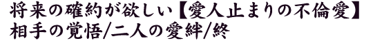 二人の関係性、あの人の態度……不満はないけど、確約された関係でないから不安になる。このままあの人は離婚しないのか、この不倫関係は一生ものなのか、あなたが望めば正式な関係まで行けるのか、見ていきます。