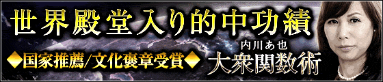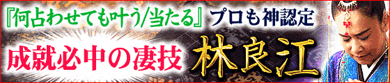 連日予約・指名争奪!『何占わせても叶う、当たる』全国各所で神評価◆驚異的な的中力と成就力で爆発的な人気を集める神技占師/林良江◆あなたの人生、結婚相手、未来の出来事を次々と言い当て、名前しか分からない好きなあの人の感情や恋の行方までも全て暴き尽します。